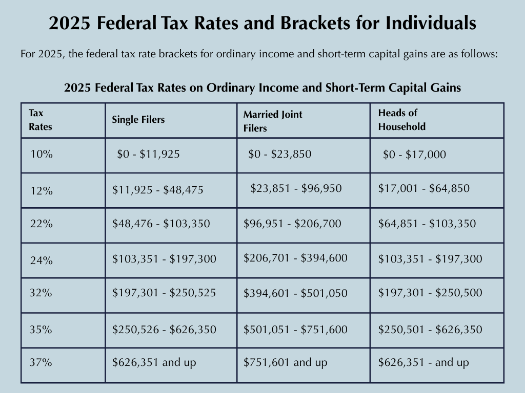 The OBBBA permanently extends the individual federal income tax rates established under the Tax Cuts and Jobs Act. The thresholds for these rates are annually adjusted for inflation. (See "2025 Federal Tax Rates and Brackets for Individuals" below.)